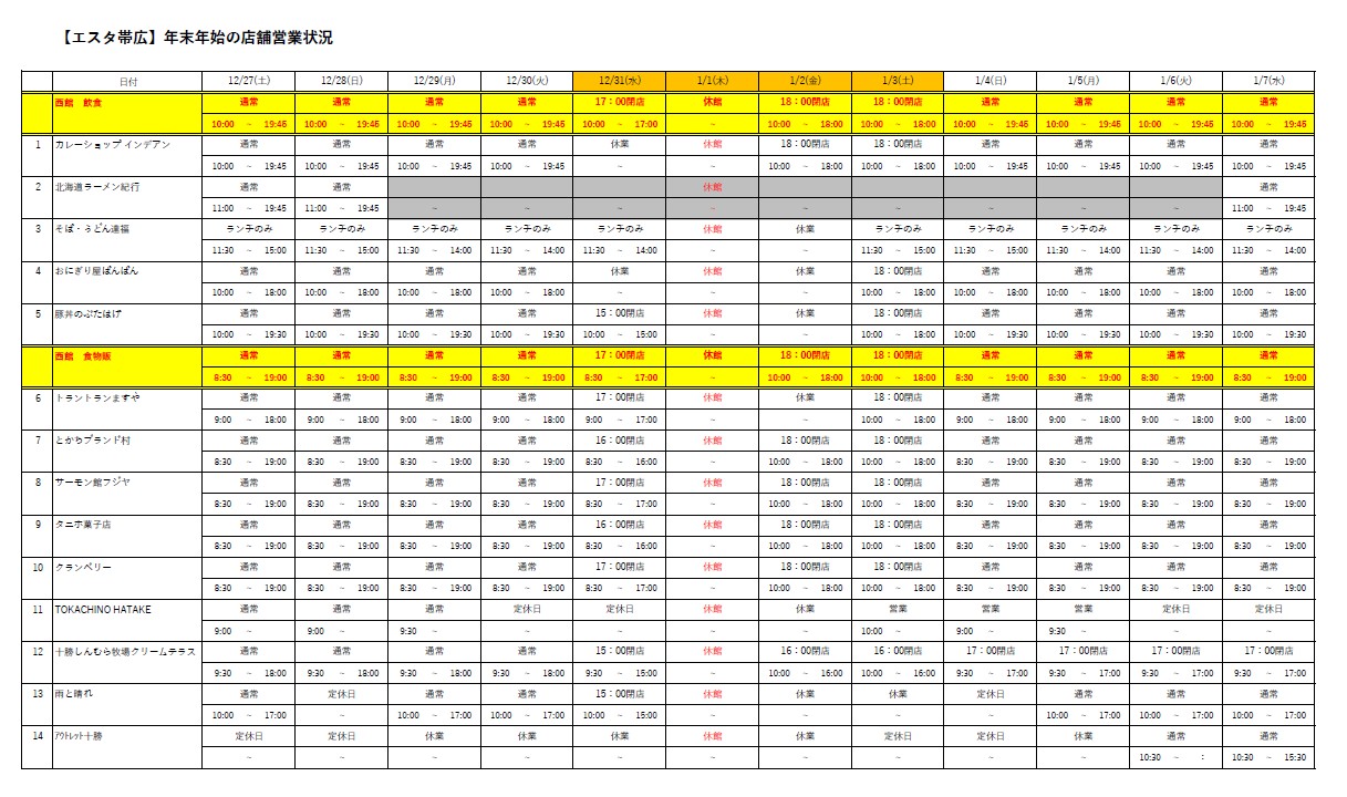 2025年12月・1月のエスタ帯広の休館日は下記の通りです。