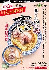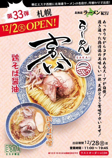 来年3月で10周年を迎える札幌麻生の人気店らーめんさかいが初出店!あっさりながらコクのあるスープが自慢!透き通った鶏清湯の美味しい一杯。具材も1つ1つ丁寧に仕込んでおり、唯一無二な味わいを楽しめます。一番人気の鶏そば醤油には和歌山県カネイワ醤油の木桶醤油をブレンド。寒い季節にもぴったりな一杯、是非ともご賞味下さいませ!