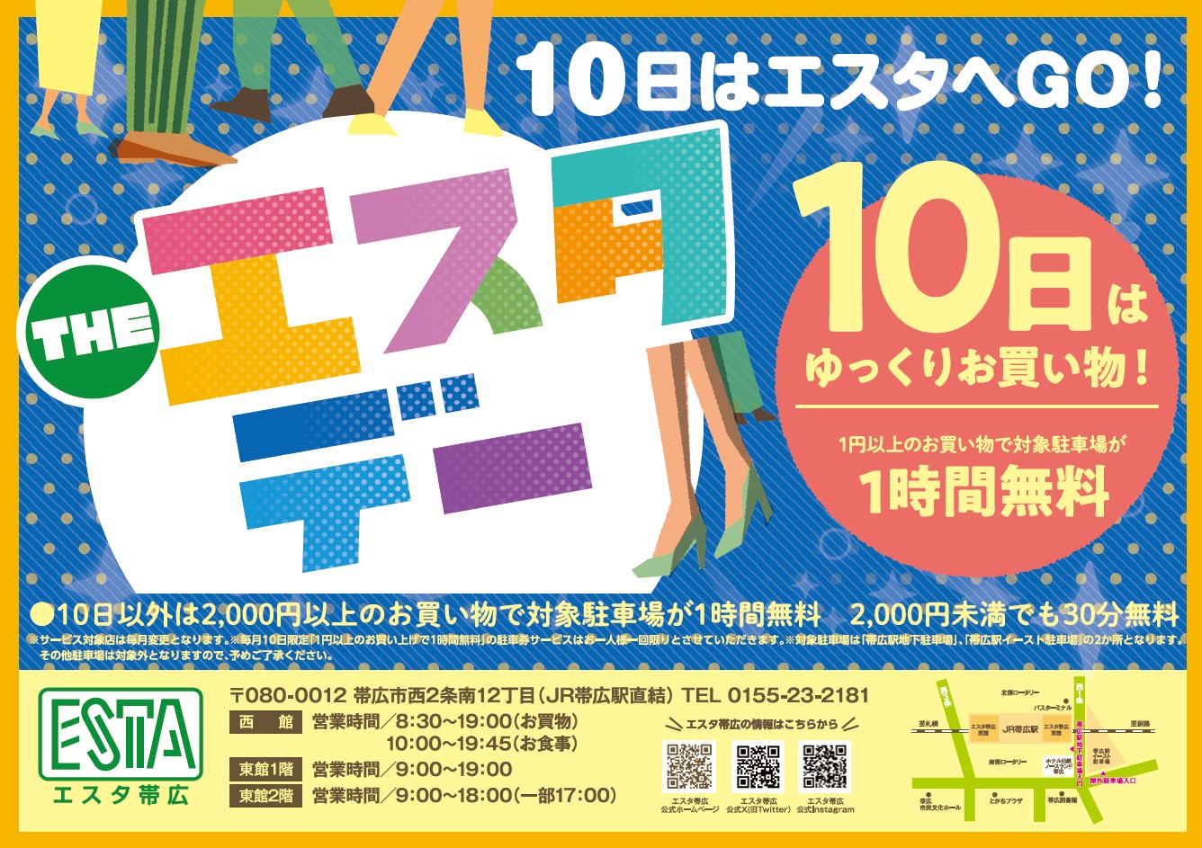 エスタ帯広「THEエスタデー」は奇数月の10日に開催!通常の駐車場サービスが2,000円未満のお買い上げで30分無料、2,000円以上のお買い上げで1時間無料のところ、「THEエスタデー」では、2,000円未満のお買い上げで1時間30分無料、2,000円以上のお買い上げで2時間無料になります。また、あわせて、当日限定のテナント特典サービスも実施いたします。