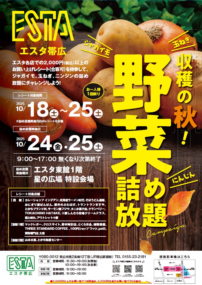 エスタ各店での税込2,000円以上のお買い上げレシート(合算可能)でジャガイモ、玉ねぎ、ニンジンの詰め放題にチャレンジできます。※お一人様一回限り